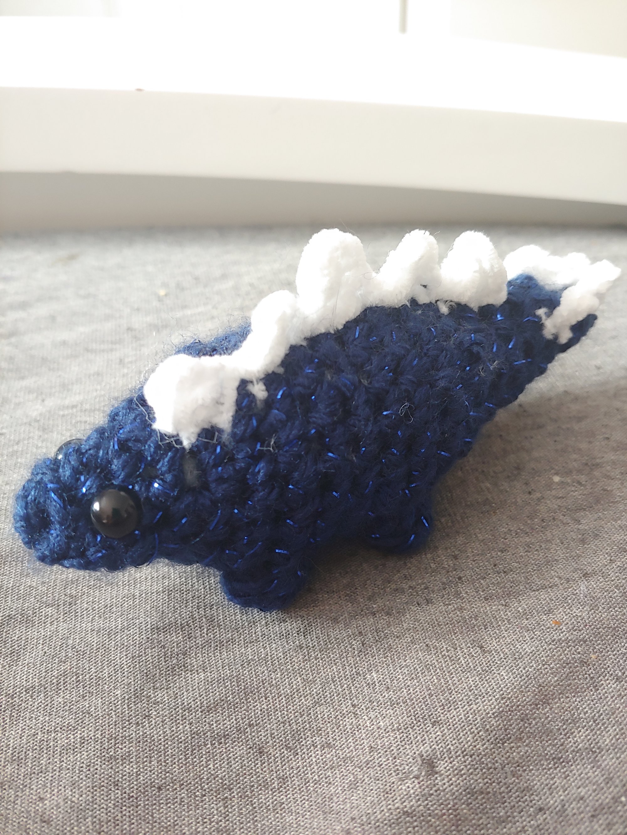 This stegosaurus, crocheted out of polyester yarn and using plastic safety eyes, is sure to bring a smile to your face any time of day.
